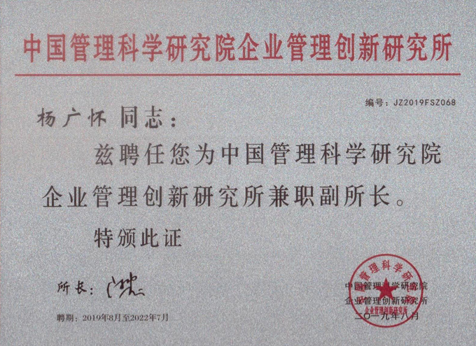 杨广怀董事长受聘为管理科学研究院企业管理创新研究所兼职副所长